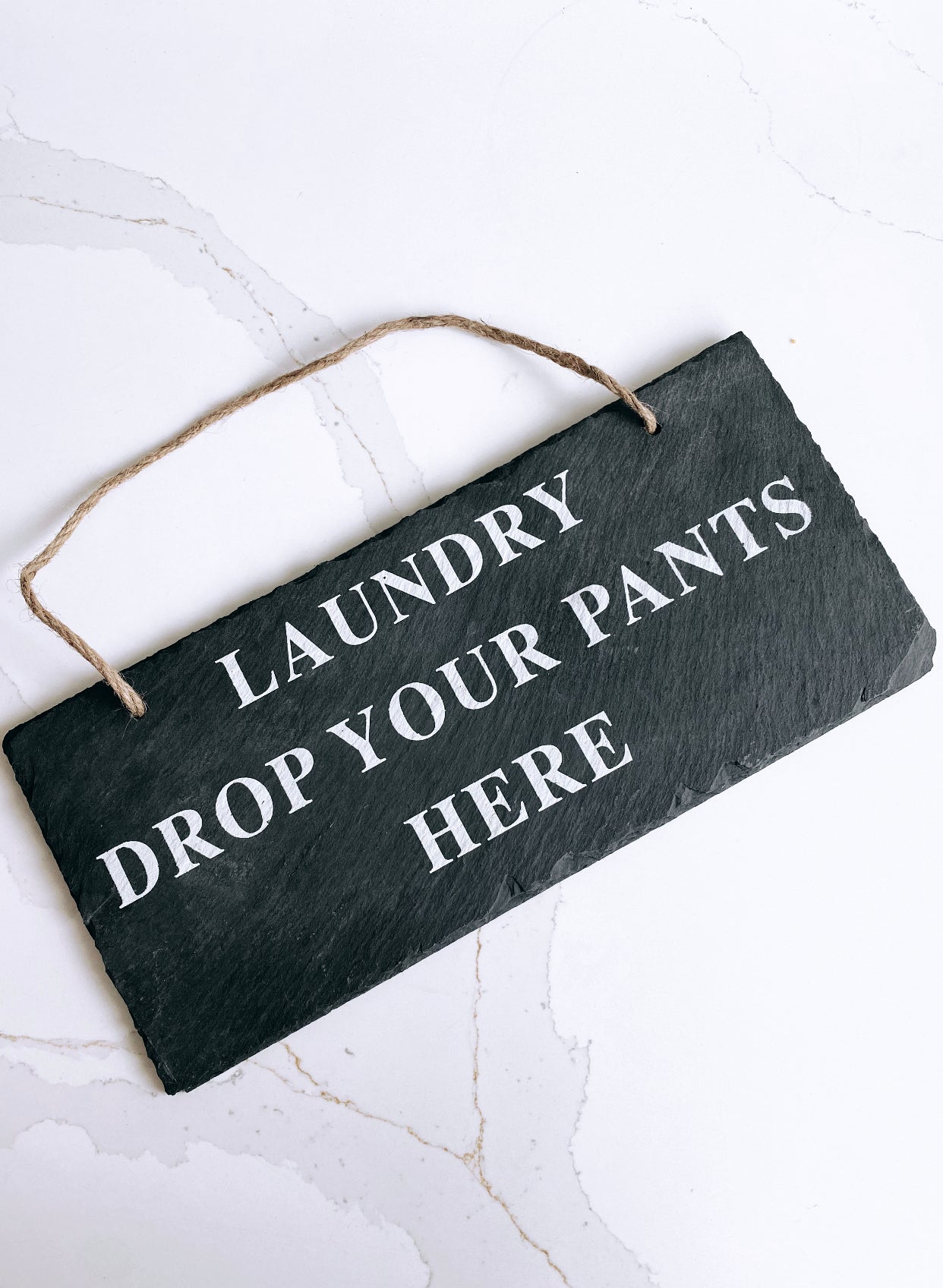 This grey slate laundry hanging sign is a perfect addition to any laundry room. Made with durable slate material, it adds a touch of sophistication while remaining functional. Its slate grey color blends seamlessly into any decor. Keep your laundry room organized with this stylish and practical sign.
