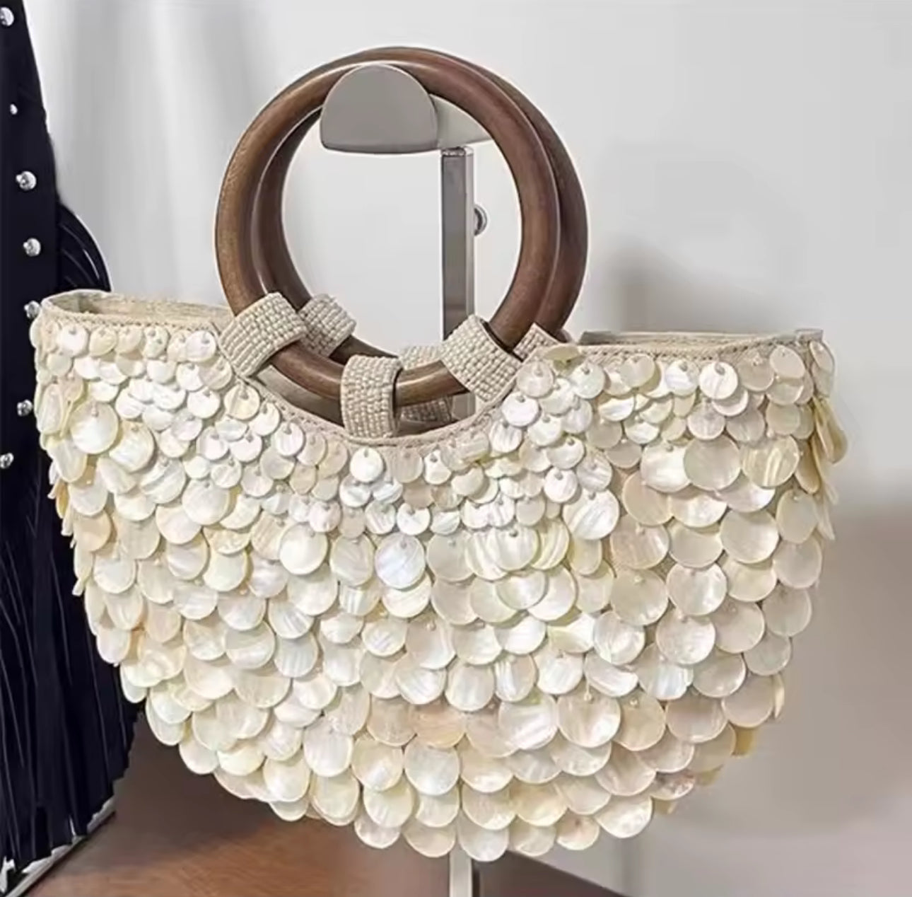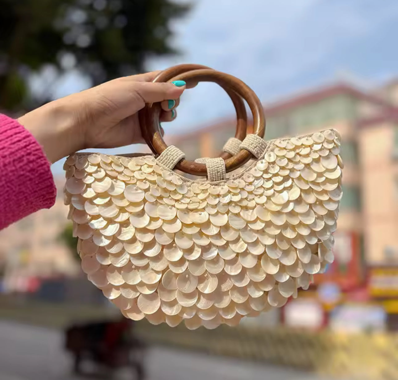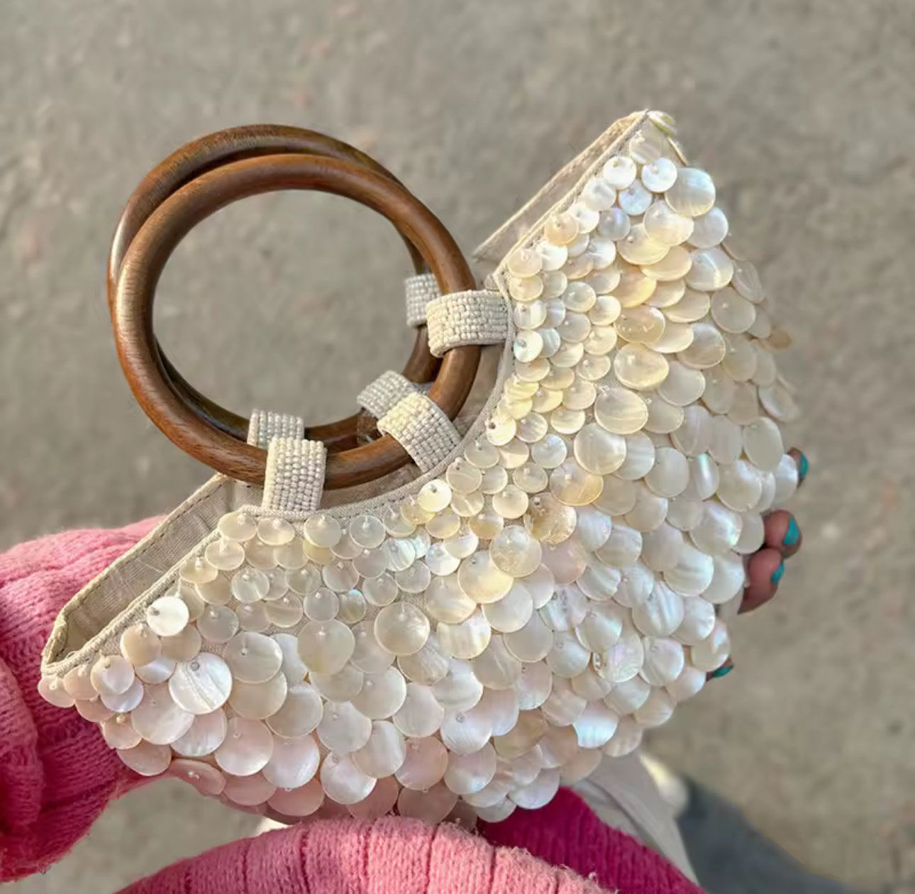 The Pearl Shell Bag is a luxurious accessory perfect for the beach club. The bag's measurements of 29x18cm make it the ideal size for carrying all your essential belongings. Handcrafted from real pearl shell, this bag exudes elegance and sophistication. Complete your beach ensemble with this stunning bag.