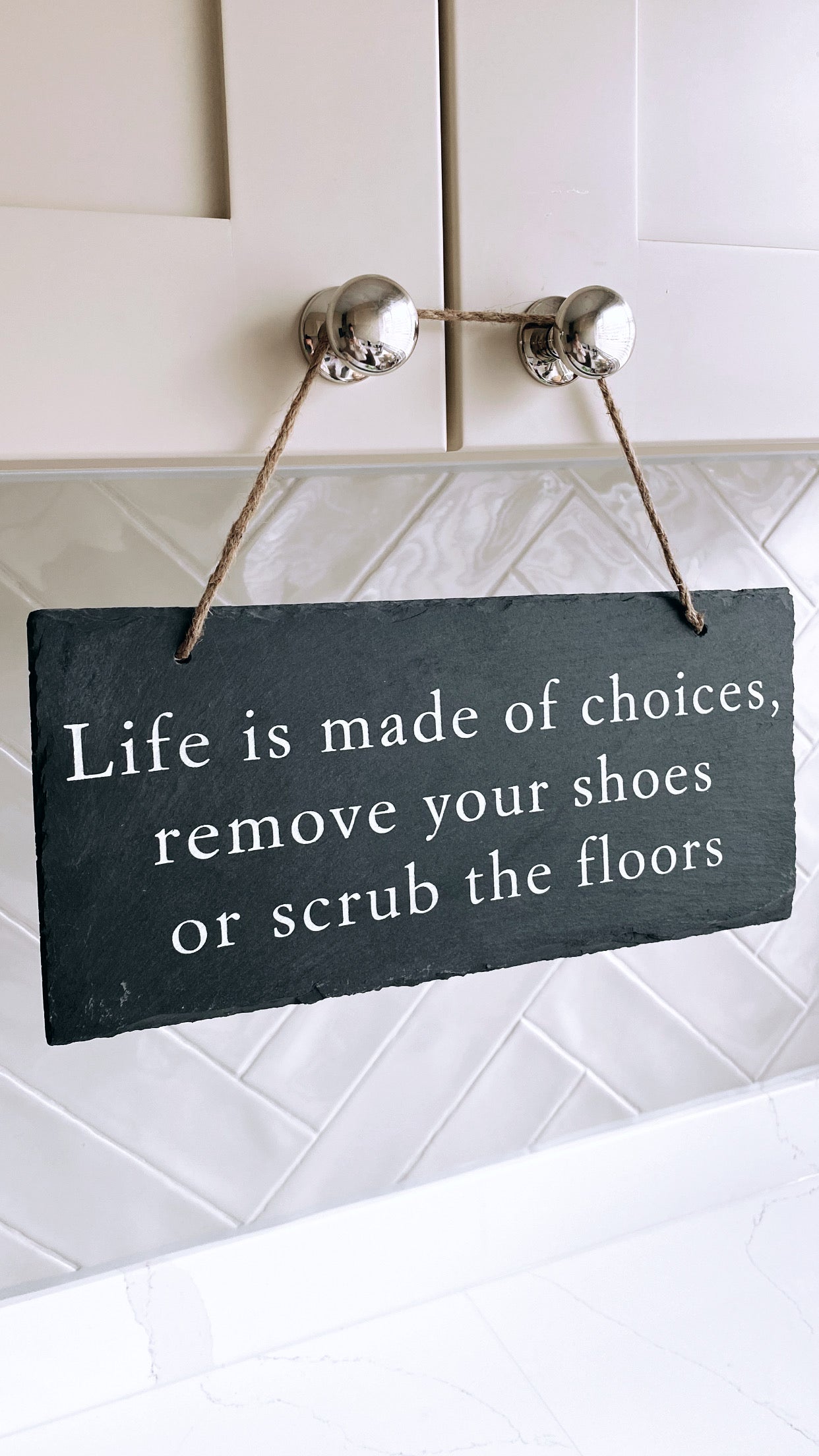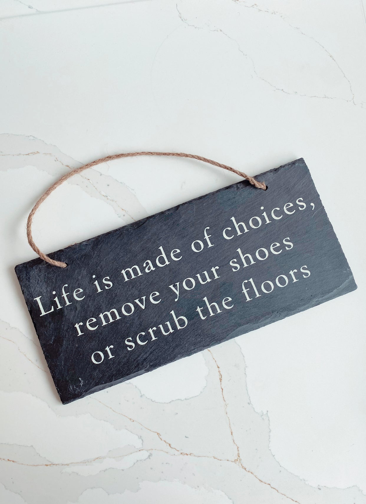 This Remove Your Shoes Slate Hanging Plaque is a stylish and practical addition to your entryway. Made of durable slate, it reminds guests to remove their shoes before entering, keeping your floors clean and protected. A must-have for any household concerned with cleanliness.