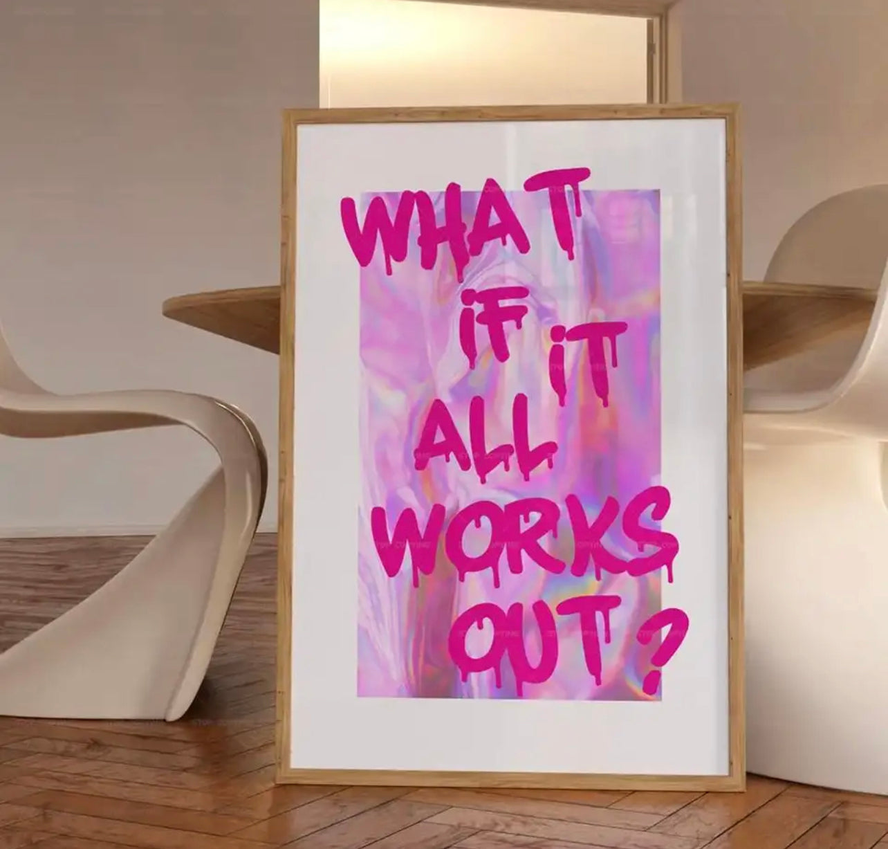 This cotton canvas print serves as a daily reminder that anything is possible. Featuring the phrase "what if it all works out" in bold, inspiring letters, this motivational poster is perfect for any space. Made from high-quality cotton canvas, it is durable and long-lasting.